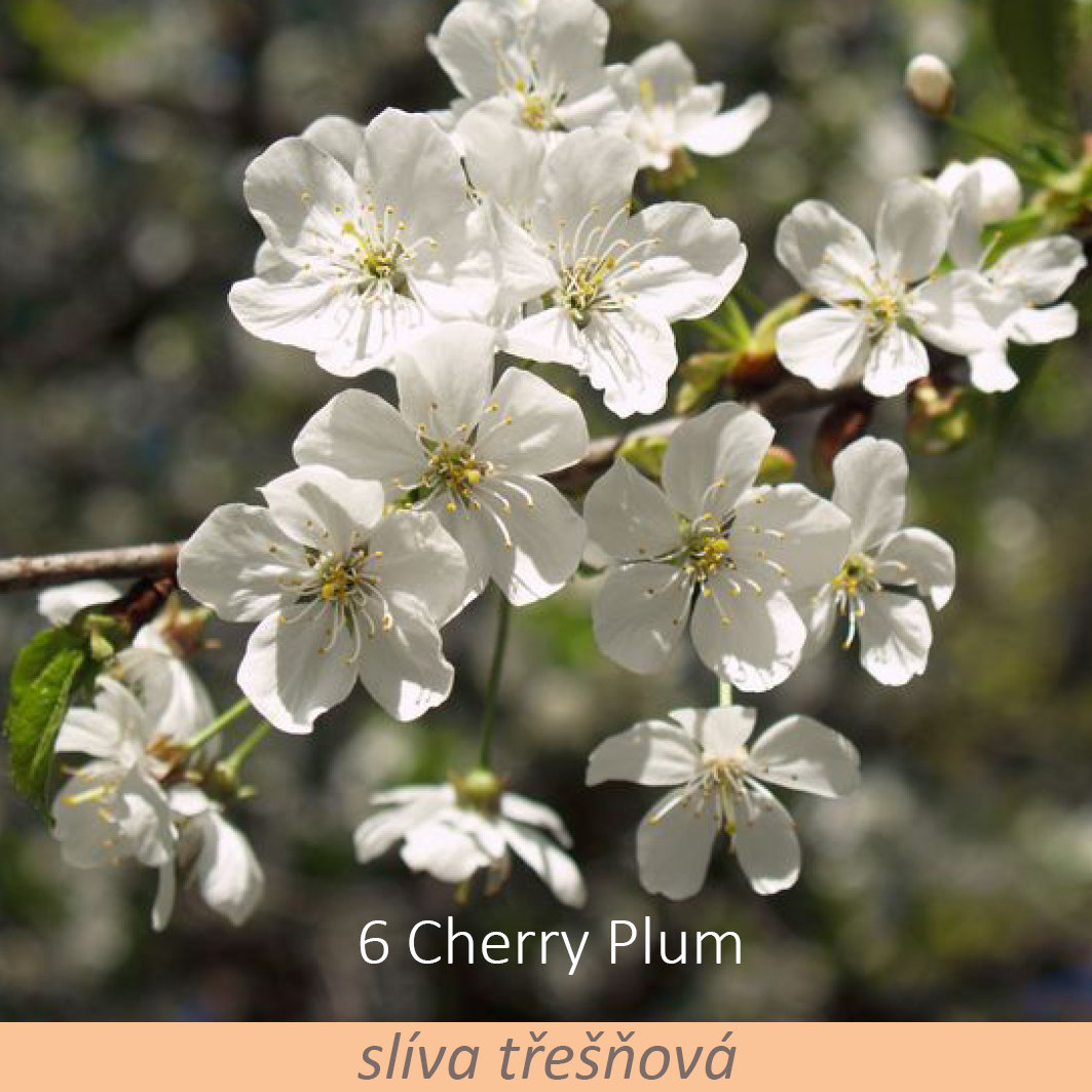 Dr. Edward Bach Cherry Plum (Prunus carasifera) zařadil do jedné ze sedmi skupin emocionálních stavů: Strachy. Slíva nám napomáhá zpracovat Myšlenky způsobující strach až k zbláznění.