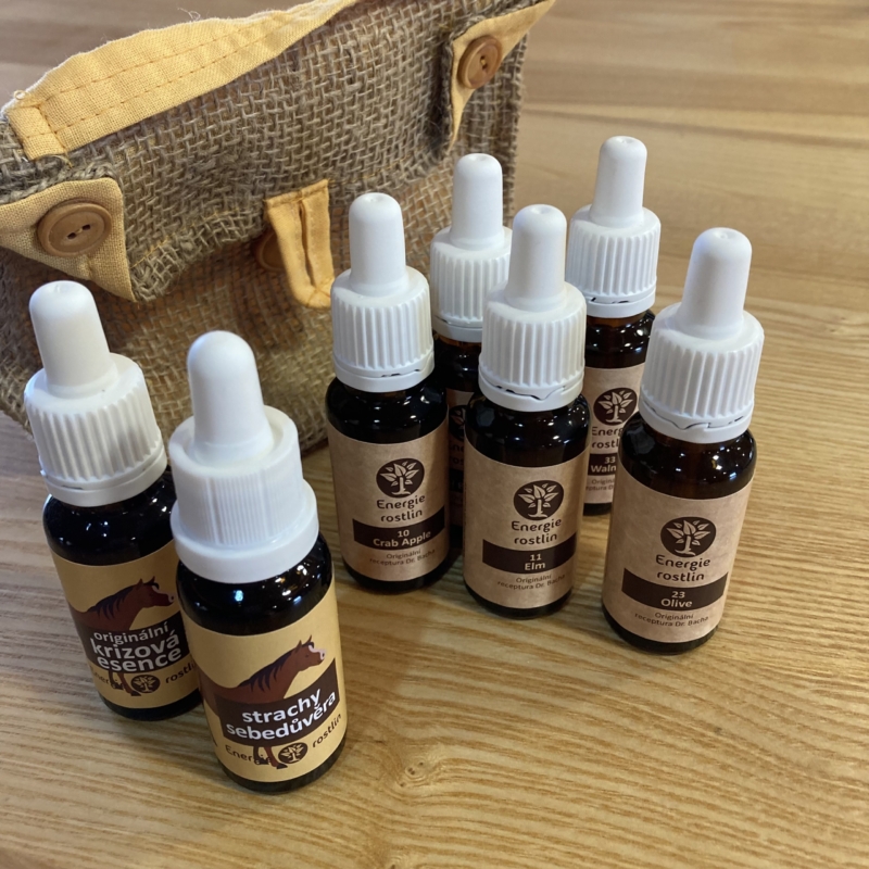 set 5 originálních Bachových jednodruhových esencí a 2 namíchané směsové lahvičky – krizová směs podle Dr. Bacha a směs na strachy a sebedůvěru (každá esence v 20ml lahvičce s kapátkem)